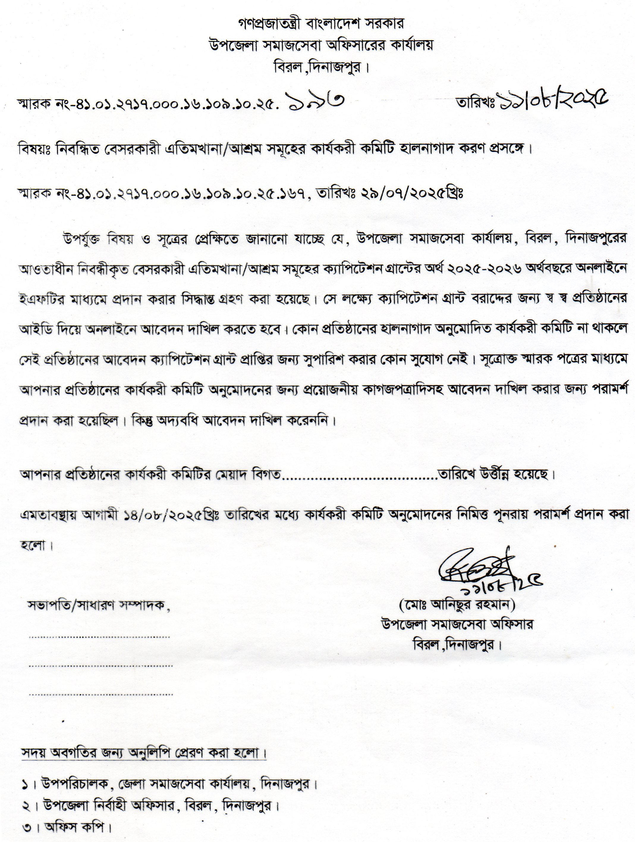 নিবন্ধিত বেসরকারী এতিমখানা/আশ্রম সমুহের কার্যকরী কমিটি হালনাগাদ করণ প্রসঙ্গে।